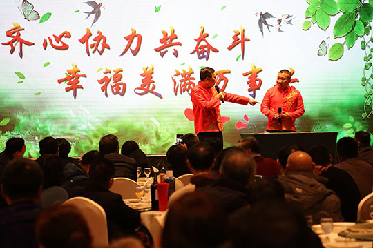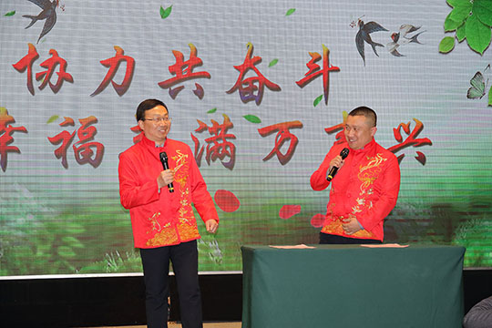 由阿彬主任、副總工阿杰自編自演的相聲《幸福三圣》,再現(xiàn)了洋溢在三圣集團(tuán)大家庭中的濃濃幸福氛圍。這篇原創(chuàng)的相聲題材,傾注了編者的智慧和用心,巧妙將2018年度三圣大事件貫穿其中,詼諧幽默,“包袱”連連,獲得滿(mǎn)堂喝彩,兩位相聲演員也被贊“三圣德云社”;