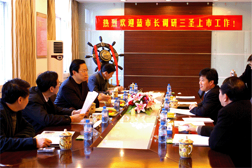 日前,南通市常務(wù)副市長(zhǎng)藍(lán)紹敏率領(lǐng)市發(fā)改、經(jīng)貿(mào)等部門主要領(lǐng)導(dǎo),到三圣公司調(diào)研上市工作,公司董事長(zhǎng)馮圣君及部分高管陪同調(diào)研。